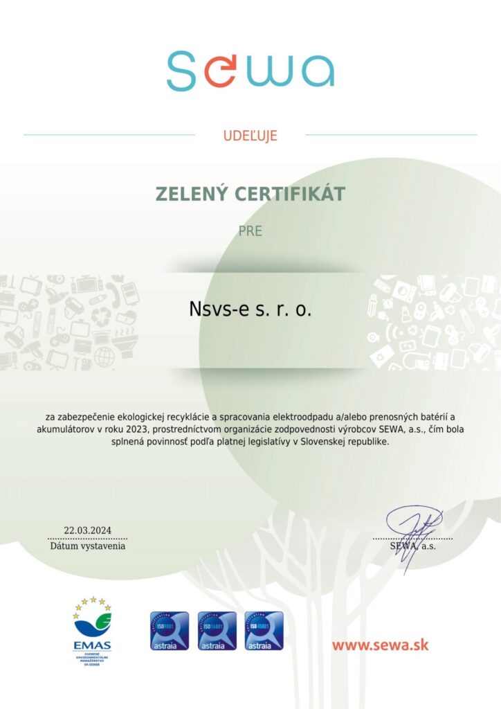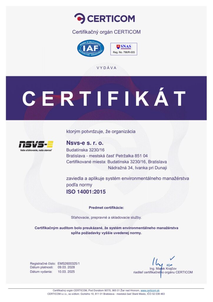 Naša práca spĺňa prísne štandardy kvality aj environmentálnej zodpovednosti. ISO certifikácie sú pre nás samozrejmosťou, a preto sme držiteľmi certifikátov ISO 9001 pre systém manažérstva kvality a ISO 14001 pre environmentálny manažment. Zároveň pravidelne získavame zelené certifikáty SEWA, ktoré potvrdzujú, že sa aktívne podieľame na ekologickej recyklácii elektroodpadu a batérií. Pre našich zákazníkov je to dôkaz, že pri sťahovaní a preprave kladieme dôraz nielen na bezpečnosť a spoľahlivosť, ale aj na udržateľný prístup k životnému prostrediu.